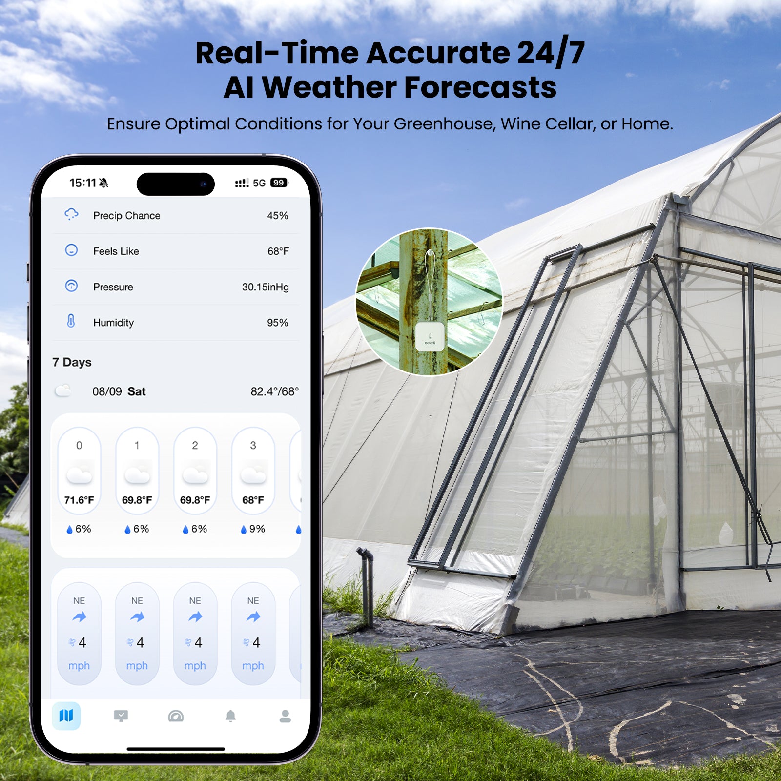 - 24H/7 Days AI Weather Forecast: The Weatherseed APP features the most advanced AI-powered weather forecasting system, delivering highly accurate 24-hour and 7-day weather predictions tailored to your specific location. This ensures you’re always prepared for sudden environmental changes, whether in your greenhouse, home, or any room