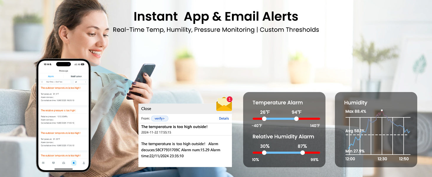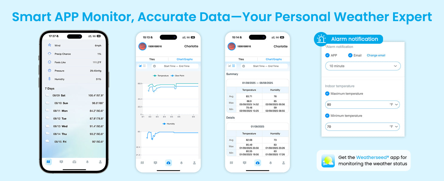 - 24/7 Instant APP & Email Alerts: Set custom temperature, humidity, and barometric pressure ranges, and receive instant alerts via the Weatherseed APP or email whenever levels fall outside your preset range. This feature is ideal for quickly reacting to sudden changes in sensitive environments like greenhouses, basements, or any room