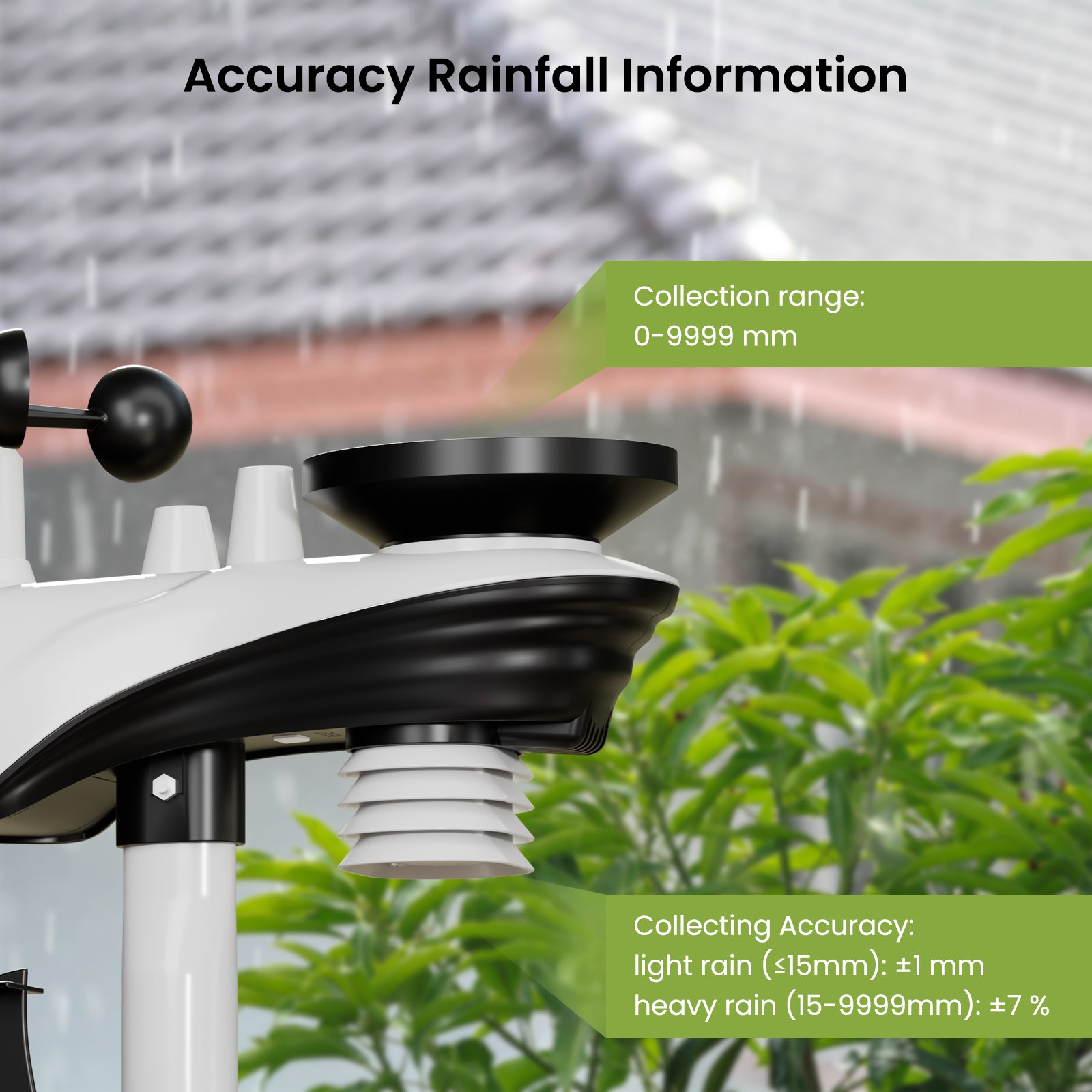 Precision Rainfall Monitor: This weather station is equipped with professional-grade rainfall measurement technology, offering high precision. For light rain (≤15 mm), the error is within ±1 mm; for heavy rain (15-9999 mm), the error range is ±7%. It features a user-friendly manual calibration function that allows you to finely adjust the measurement data according to local conditions, providing you with accurate precipitation data continuously. It is very suitable for technology enthusiasts, IT professionals, engineers, pilots and other groups to use