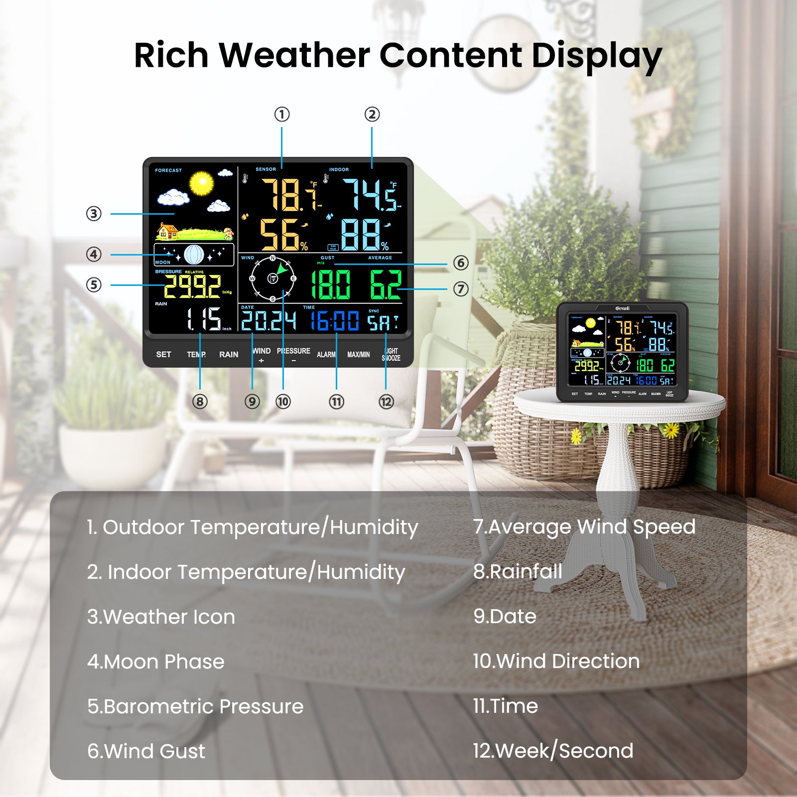 Comprehensive Weather Monitoring: The display screen of this weather monitoring device can simultaneously display multiple core weather parameters and track weather data in real-time. It supports temperature monitoring indoors (32 to 140°F) and outdoors (-40℉ to 60℉), humidity detection from 10% to 99%, and barometric pressure measurement in the range of 300 - 1100 hPa. It integrates professional weather functions such as real-time monitoring of wind speed and direction, cumulative rainfall statistics, dew point temperature, and perceived temperature. Powered by solar energy with battery(not included) backup for 24/7 reliable operation.