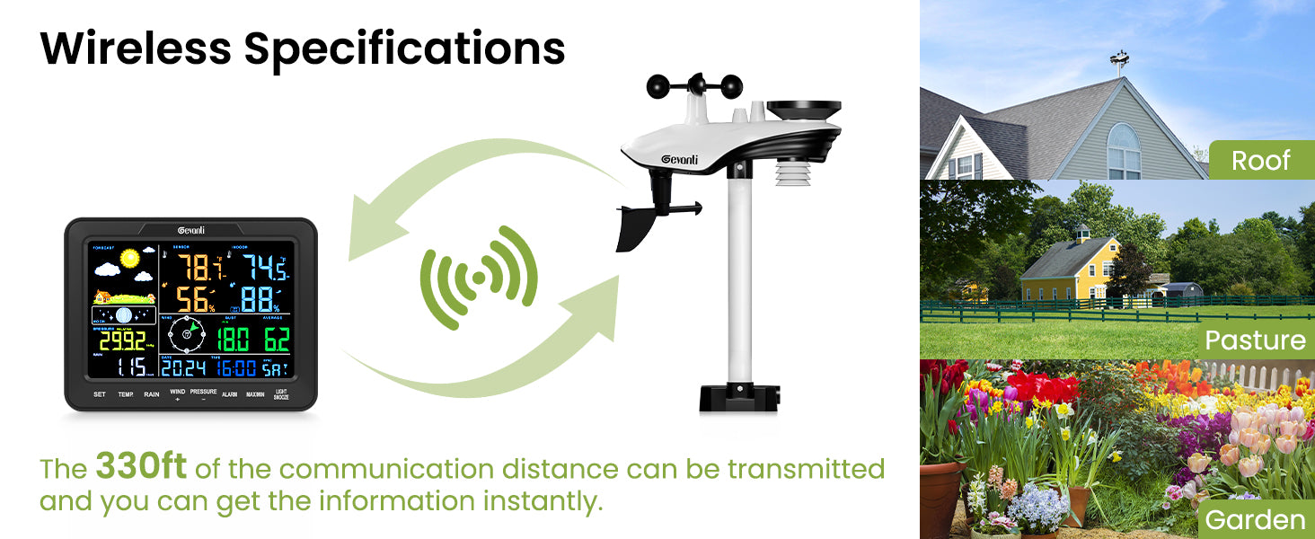 330ft Wireless Transmission Range: This professional-grade weather device utilizes 330ft/100m long-range wireless transmission technology, making it particularly suitable for large outdoor areas like orchards and farms. It delivers reliable data transmission without wiring requirements while maintaining stable connectivity even in challenging environments